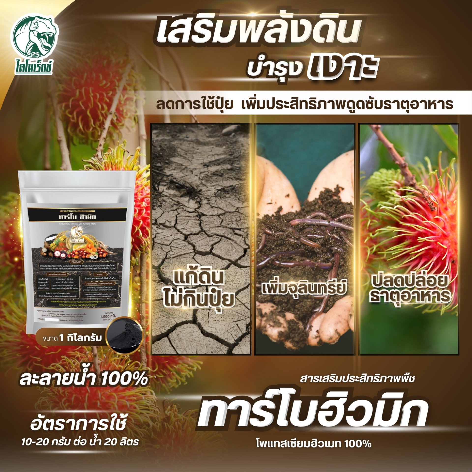 ฮิวมิกเงาะ แก้ปัญหาดินเสีย ฟื้นฟูระบบราก ทรงสวย ผลดก ขยายผลใหญ่ ขั้วเหนียว ต้นสมบูรณ์ ใบเขียวนาน รากแทงไว รากแข็งแรง