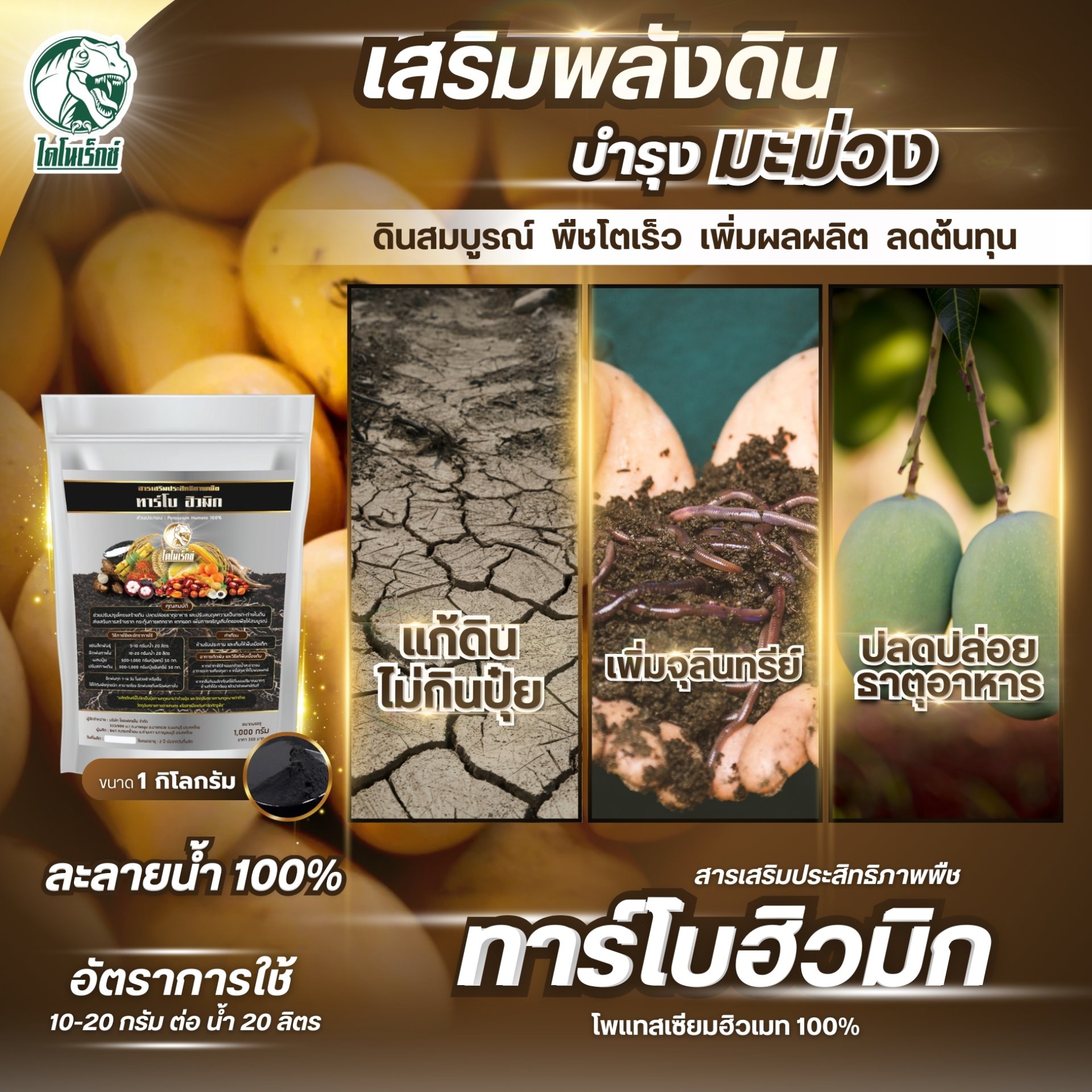 - เป็นอาหารพืชชนิดผง ทาร์โบ ฮิวมิก (โพแทสเซียมฮิวเมท 100%) อินทรีย์วัตถุคุณภาพสูง ละลายน้ำ100เปอร์เซ็นต์